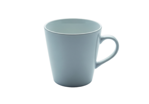 Plain light blue ceramic mug with handle on right side shown on white background with tapered shape and smooth surface ideal for product mockups, kitchenware branding, and editorial content