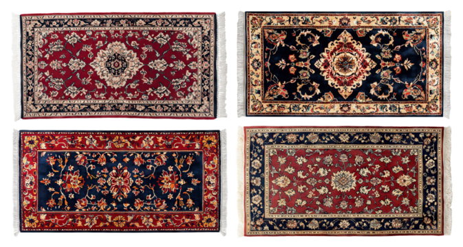 Set of traditional Persian rugs with intricate patterns, isolated on transparent cutout background