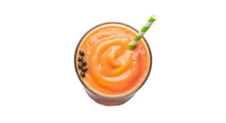 Refreshing orange smoothie in a glass with a green straw and tapioca pearls on a white background