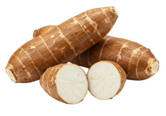 Fresh cassava root with leaves, sliced for cooking and healthy eating