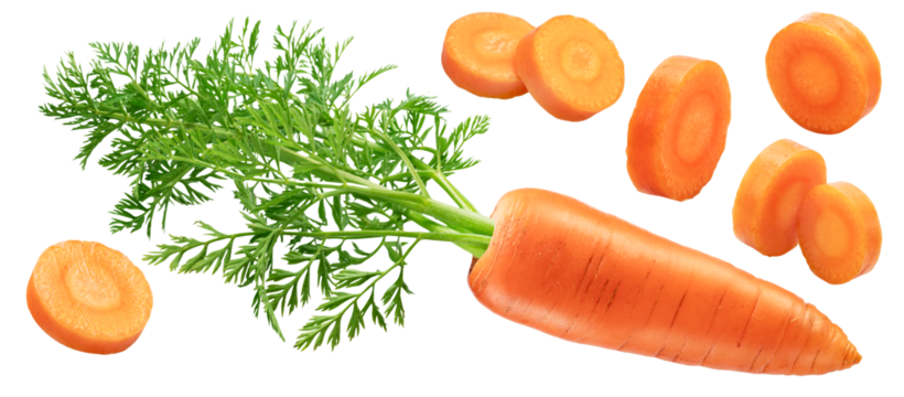 Vibrant orange carrot vegetable falling. fresh, healthy food and raw ingredient for an organic diet, isolated on transparent background