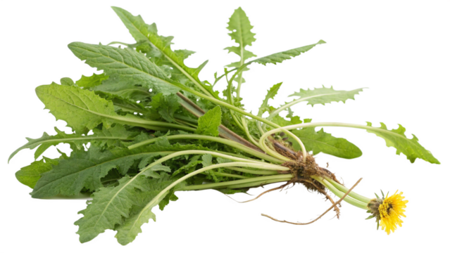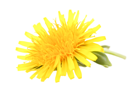 Yellow dandelion flower blooming, showing vibrant petals and green leaves, isolated on transparent background