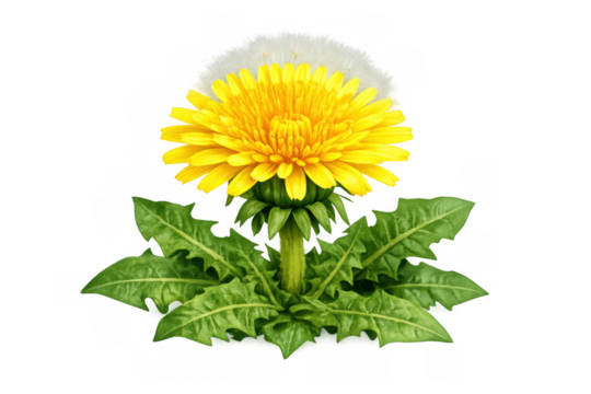 Dandelion flower blooming with its bright yellow petals, green leaves, and white seed head, transparent background