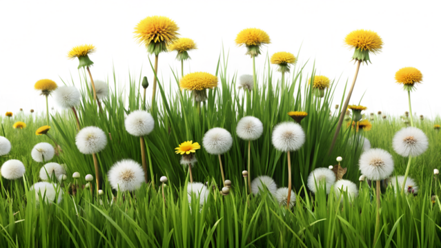 A vibrant field of dandelions with yellow and white flowers growing in green grass, isolated on transparent background