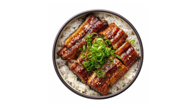 Delicious unadon featuring grilled eel with tare sauce and green onions served over steamed white rice