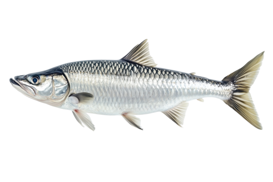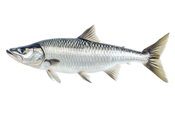 A majestic tarpon fish swimming gracefully, showcasing its silver scales in clear waters, isolated on transparent background.