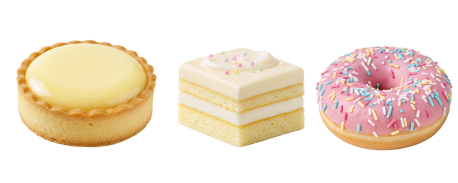 A classic bakery dessert set with a slice of lemon tart, a layered cake slice, and a pink-frosted donut. This delicious collection offers a variety of popular sweet treats.