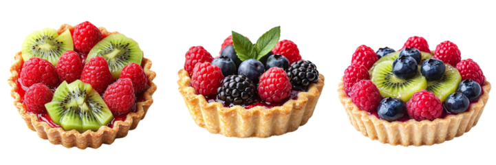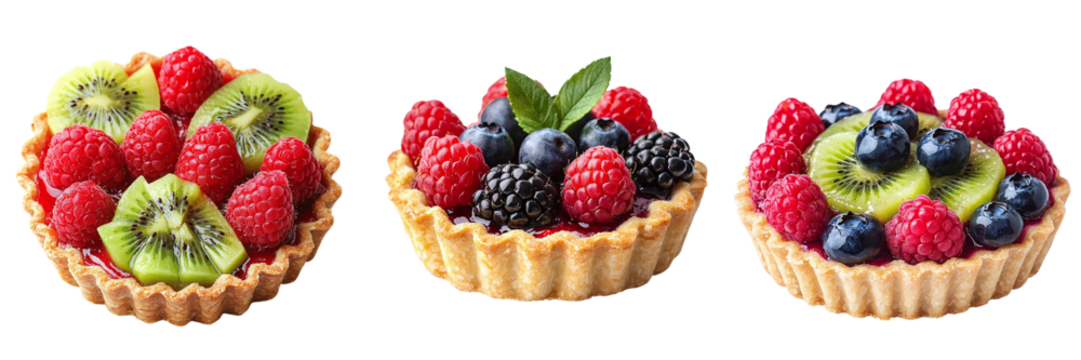 Set of delicious desserts tartlets with kiwi, raspberry, blueberry and blackberry isolated on transparent background PNG