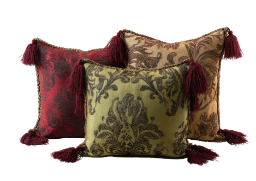 A luxurious velvet pillow in a rich mauve hue, featuring intricate gold geometric patterns and decorative tassels on each corner, isolated. background removed