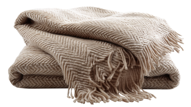 Folded terracotta-colored throw blanket with a subtle, patterned design and tassels