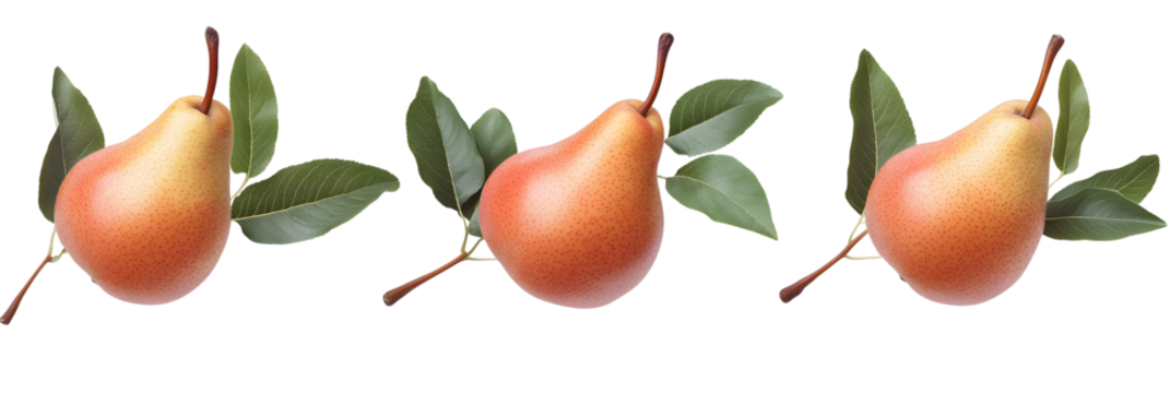 Elegant arrangement of three pears with leaves on a stark black background