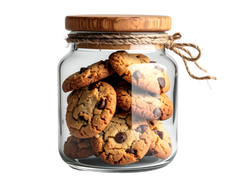 Clear glass jar filled with chocolate chip cookies, light brown wooden lid, and twine