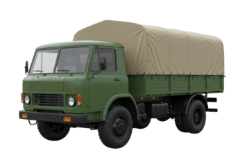 Isolated green military cargo truck with a khaki-colored tarpaulin, automotive vehicle