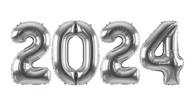 Four large golden metallic foil balloons precisely shaped '2024', reflective with crisp edges and soft highlights, against a uniform transparent background, high-end commercial studio concept
