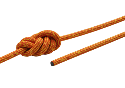 macro shot of vibrant red and yellow nylon climbing rope tied in a taut figure eight knot against a transparent background, directional high-key studio lighting, sharp drop shadow, concept of