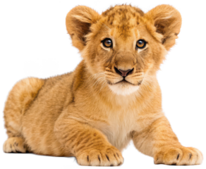 A fluffy, adorable, and realistically rendered baby lion cub with soft, tawny fur and large, expressive eyes, gently resting with its paws extended in a relaxed, isolated on transparent background.