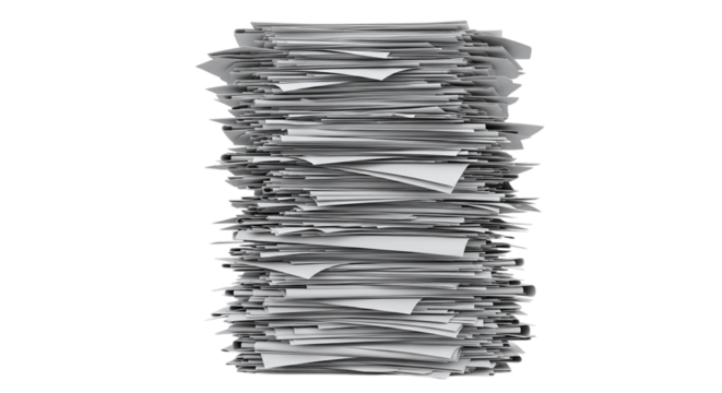 Isolated messy paperwork pile with ring binders in office or home storage, archive stack