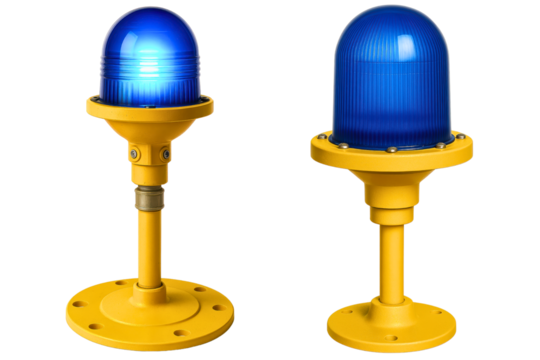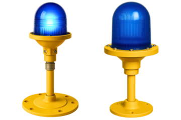 Bright blue aircraft runway lights on yellow stands on a transparent background