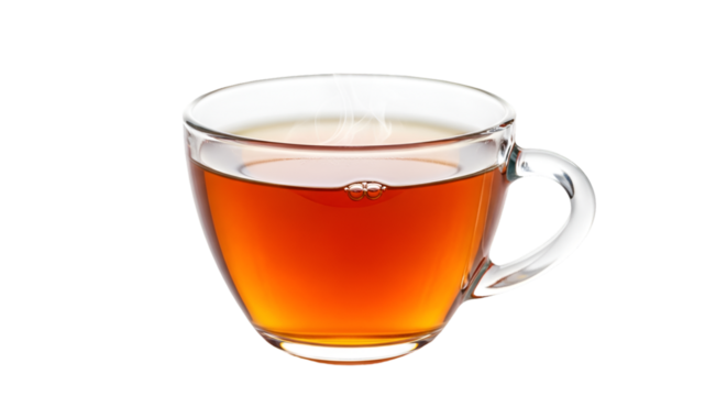 Glass mug of hot spiced tea with cinnamon stick and star anise, isolated on transparent background