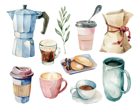 set of cups of coffee watercolor texture decorative stickers