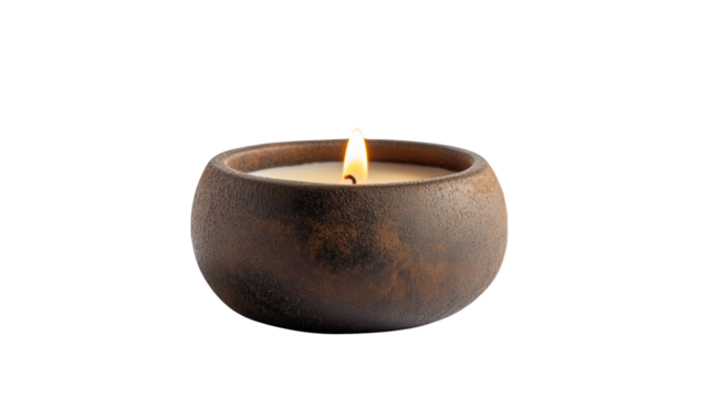 A glowing candle in a plain golden bowl isolated on PNG white transparent background.