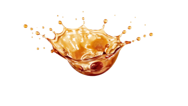 Coffee splash or brown beverage flow creating a dynamic wave with drops, transparent background