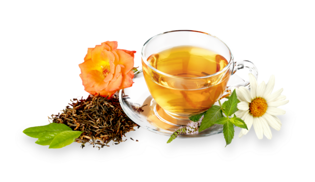 Cup of tea with fresh tea leaves on a saucer transparent background PNG Pro PNG