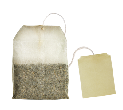 Teabag with paper label isolated. PNG transparency