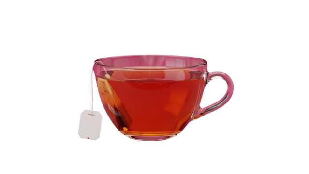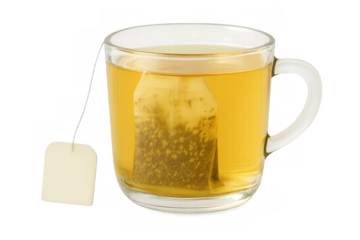 Transparent glass cup of hot tea with tea bag isolated on transparent background