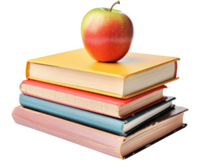A red apple resting atop a stack of three books against a  transparent background png