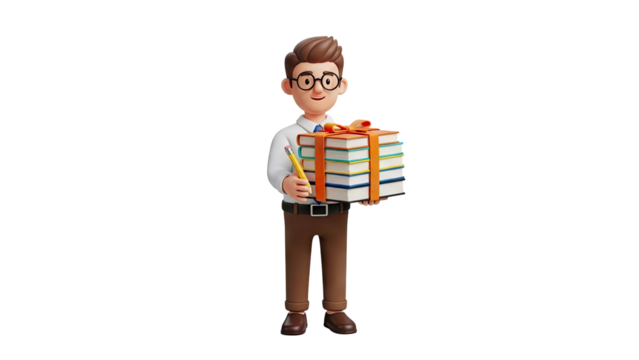 3D Cartoon man holding a stack of books and a pencil on transparent background