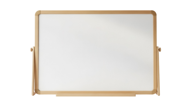 Wooden framed whiteboard isolated PNG, blank writing board for presentations and teaching, school supplies on transparent background