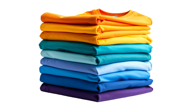 Collection of eight different colored T-Shirts displayed in two rows isolated on transparent background
