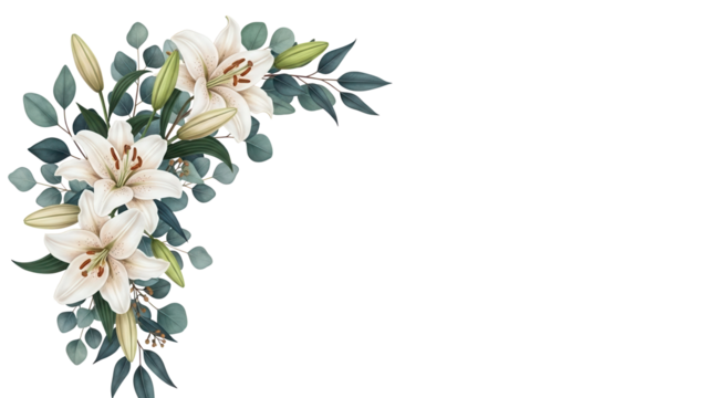 Luxury botanical corner element with lilies and eucalyptus in deep teal and beige isolated on white background
