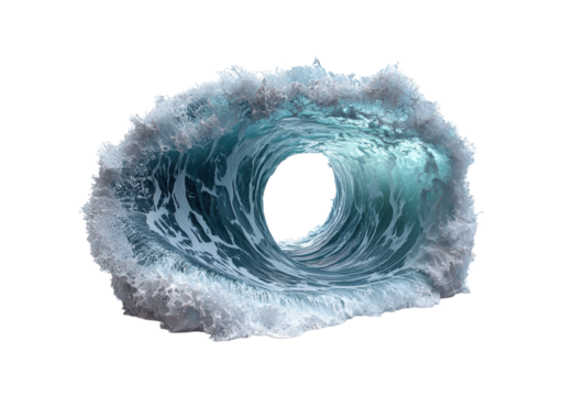Powerful Ocean Wave Barrel with Turquoise Water and White Sea Foam, Dynamic Tropical Storm Surf Breaking Wave Tunnel Isolated on Transparent and White Background