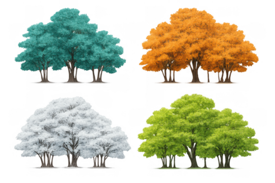 Four seasons trees illustrating cyclic change and natural environment throughout the year, transparent background