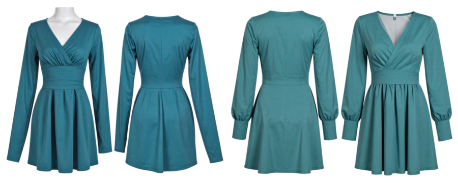 Teal Long-Sleeve V-Neck Dress, Front View, Flared Skirt, isolated on transparent background PNG