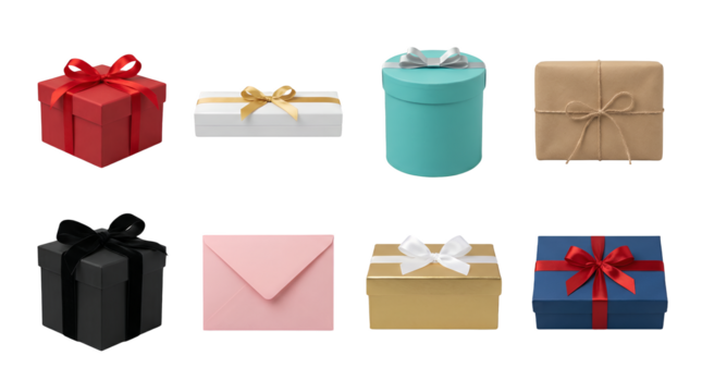 Gift box and envelope set including red, blue, gold, black, and teal packages with ribbons isolated. Holiday and celebration packaging collection.