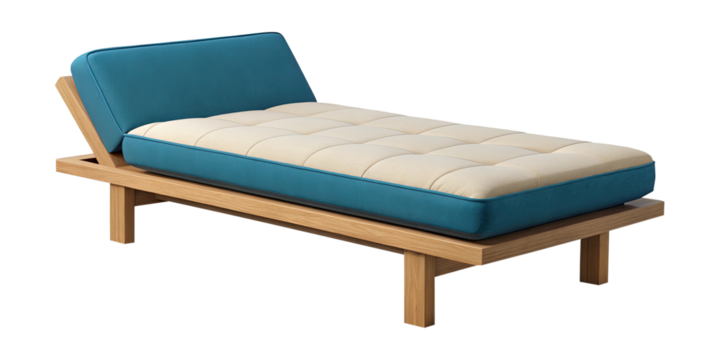 Comfortable indoor chaise lounge with wooden frame and teal upholstery