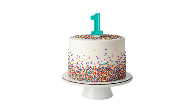 White frosted cake, with colorful sprinkles and a teal number one candle, PNG isolated on white or transparent background