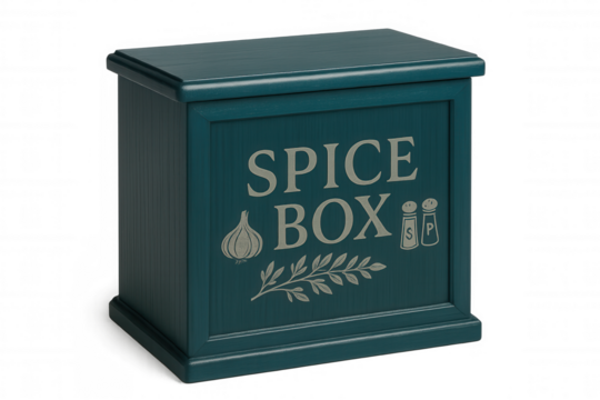 Teal spice box with decorative garlic, salt and pepper shakers and lettering isolated on a transparent background
