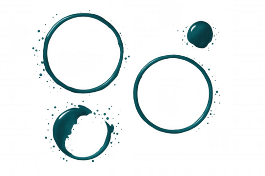 Teal paint splattering, creating circular patterns and droplets, highlighting creative design with transparent backdrop