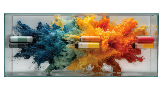 A vibrant explosion of colorful powder paint erupts from glass containers with cylinders inside isolated on transparent background