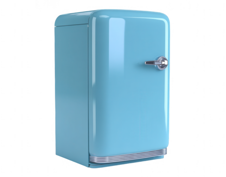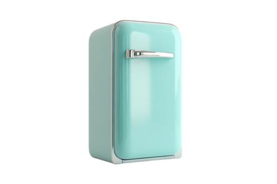 Vintage teal refrigerator stands elegantly in a bright, minimalistic kitchen setting isolated on transparent background