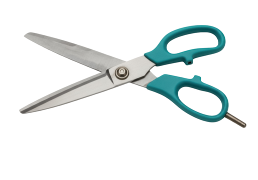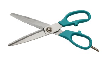 Teal handled scissors isolated PNG on transparent background, sharp cutting tool for paper crafts and office use