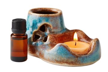 Ceramic fondue pot set with wooden handle and tealight candle for cheese chocolate dessert fondue party on transparent background