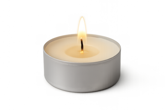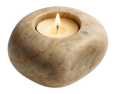 Frosted glass candle holder with warm glowing flame inside minimal decor ambience close up on isolated background