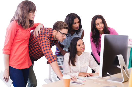 Diverse team collaborating looking at a laptop screen isolated on transparent background
