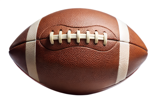 Realistic American football PNG on transparent background, brown leather ball cutout with white stripes and laces, 3D element for sports design, game graphics, and team branding.