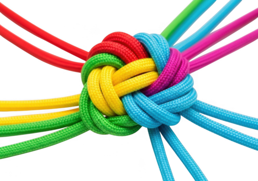 Colorful ropes tied together in a knot, symbolizing unity, connection, and teamwork